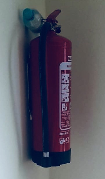 1.Feuerlöscher aus Halterung nehmen und zum Brandort gehen.