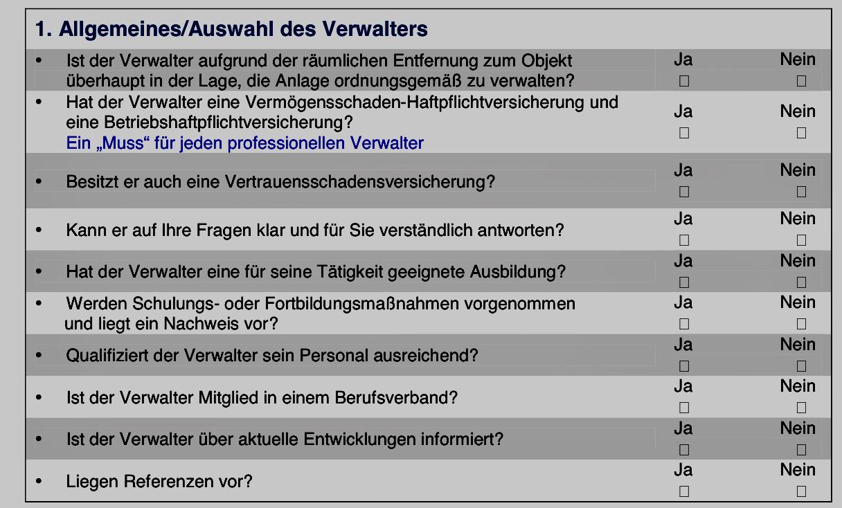 Insgesamt umfasst der Fragenkatalog 50 Fragen. Diese zielen unter anderem auf die Fortbildungsmentalität des Unternehmens, die Erreichbarkeit des zuständigen Verwalters und den Zustand anderer Referenzobjekte ab. Aber auch die Themenbereiche Versicherungsschutz, kaufmännische Geschäftsführung, Finanz- und Vermögensverwaltung, Vertragsgestaltung sowie technische Verwaltung und Sanierung greift die Checkliste auf. Je mehr Sie von den Fragen positiv beantworten können, desto professioneller arbeitet Ihre Verwaltung.