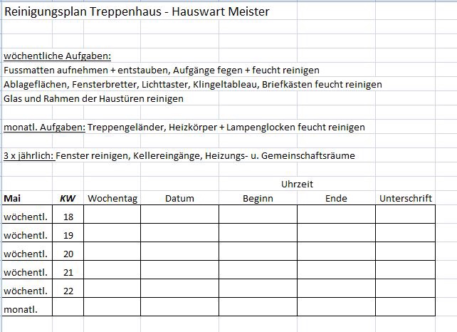Als Hilfestellung für den Hauswart wurde von einem kritischen Beirat die Aufgabenliste aus seinem Arbeitsvertrag um den Punkt Zeitaufwand ergänzt, so dass untenstehende Tabelle entstand.