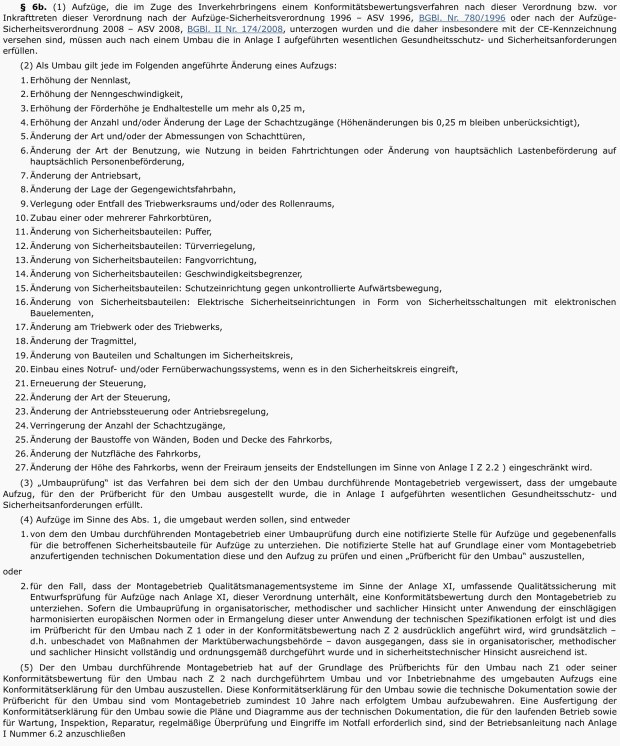 Es gilt § 6b der Verordnung des Bundesministers für Wissenschaft, Forschung und Wirtschaft über die Sicherheit von Aufzügen und von Sicherheitsbauteilen für Aufzüge (Aufzüge-Sicherheitsverordnung 2015 – ASV 2015):