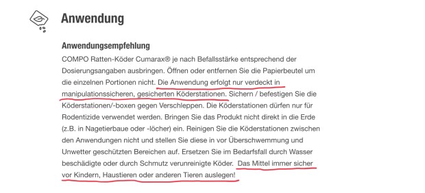 § 3 (7)     Bei notwendigen Bekämpfungsmaßnahmen ist durch die bzw. den beauftragten Schädlingsbekämpferin oder Schädlingsbekämpfer in geeigneter Form auf die Köderauslegung hinzuweisen, jedenfalls ist ein entsprechender Anschlag deutlich sicht- und haltbar anzubringen. Vorsichtsmaßnahmen zur Vermeidung von Gefahren für Mensch und Tier sind an Ort und Stelle zu treffen, Rattenkadaver und nicht aufgenommene Köder sind unverzüglich einzusammeln.