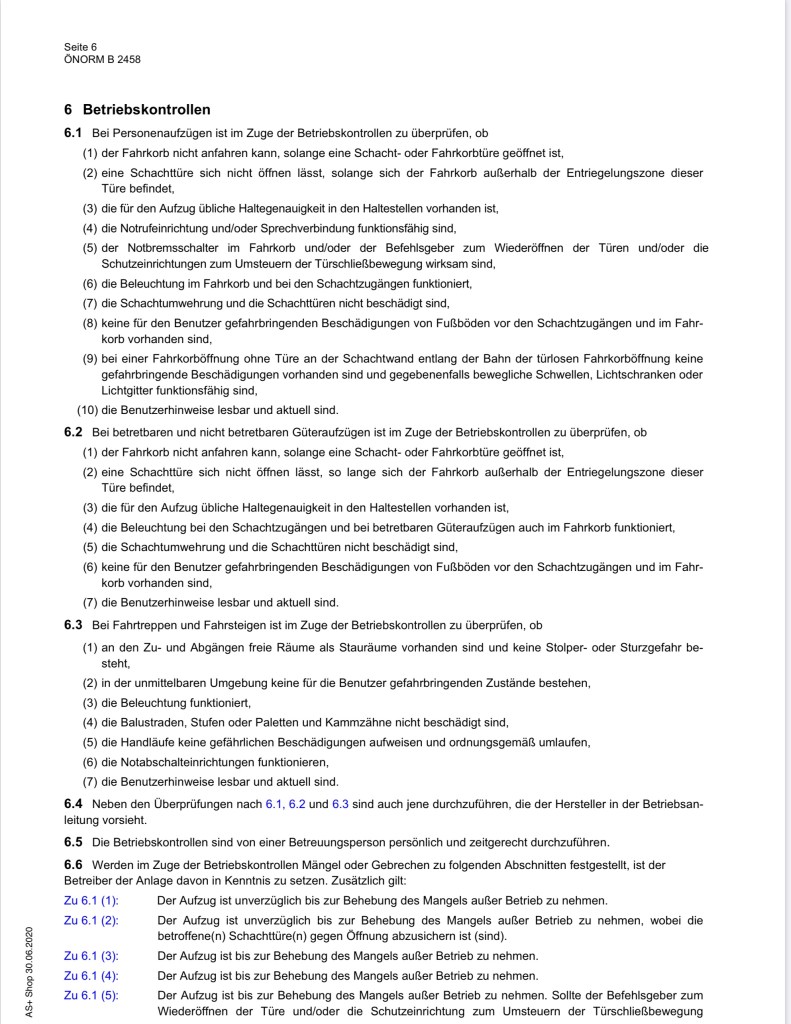 (1)Bei Aufzügen und Hebeeinrichtungen für Personen sind – unbeschadet Abs. 2 und 3 – die Betriebskontrollen an jedem Betriebstag durchzuführen.